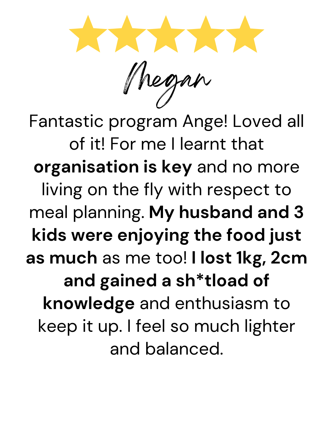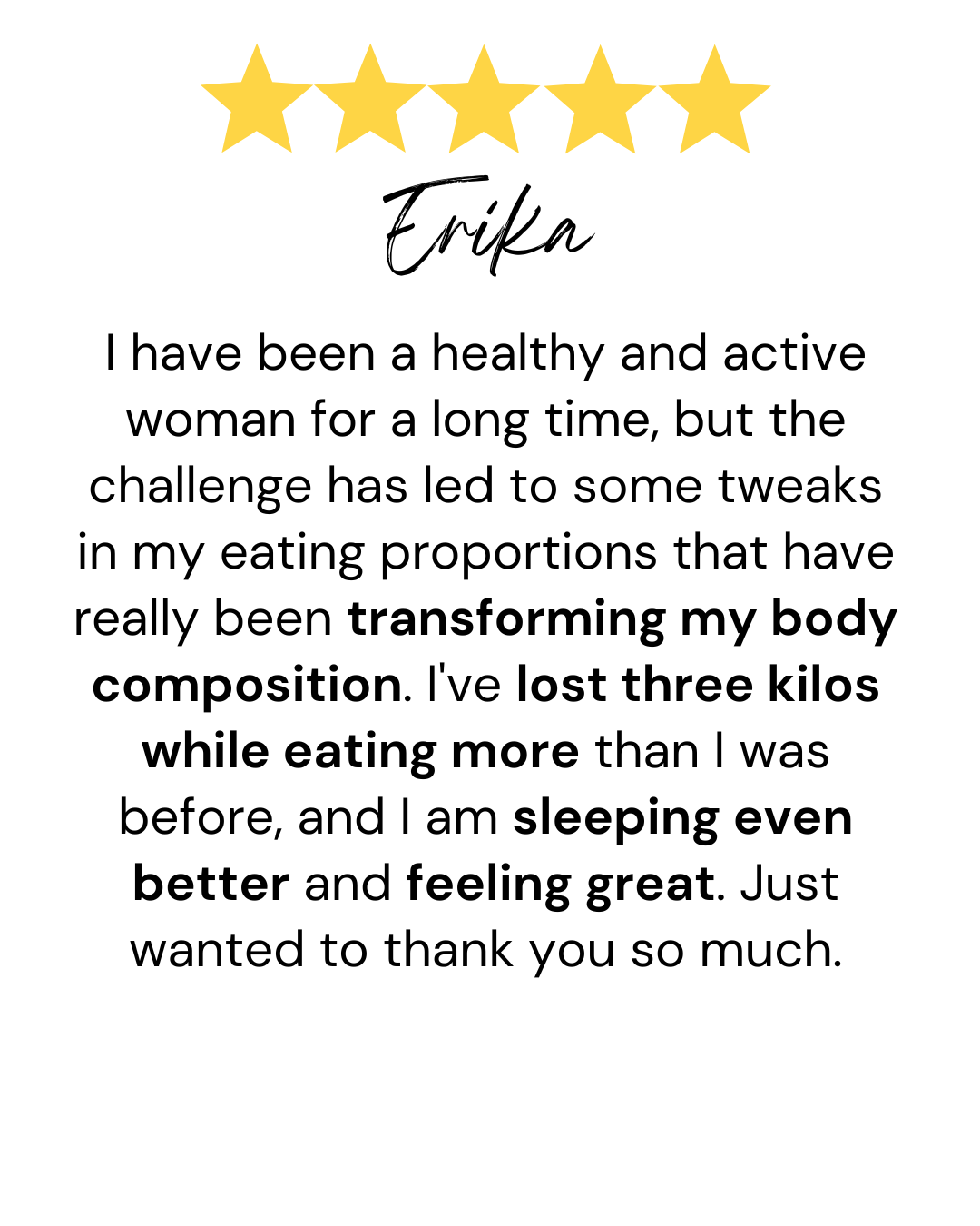 I lost 1kg in a week, but what really blew me away was the increase in my energy levels, it felt like night and day after only a few days. I’m so grateful for this challenge and will definitely be using the tools and insights moving forward."