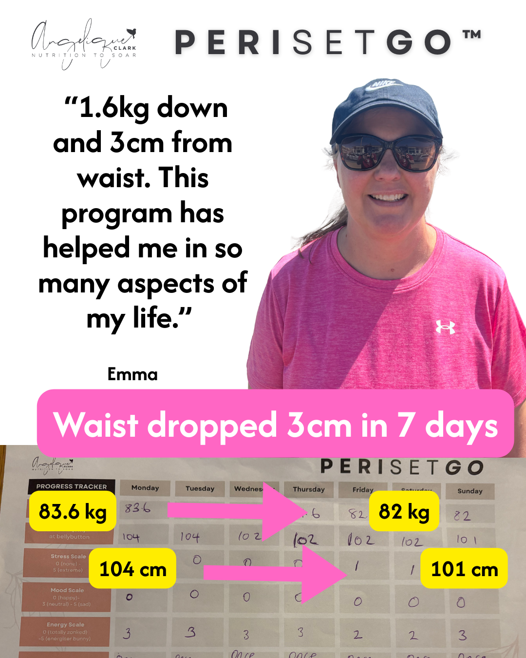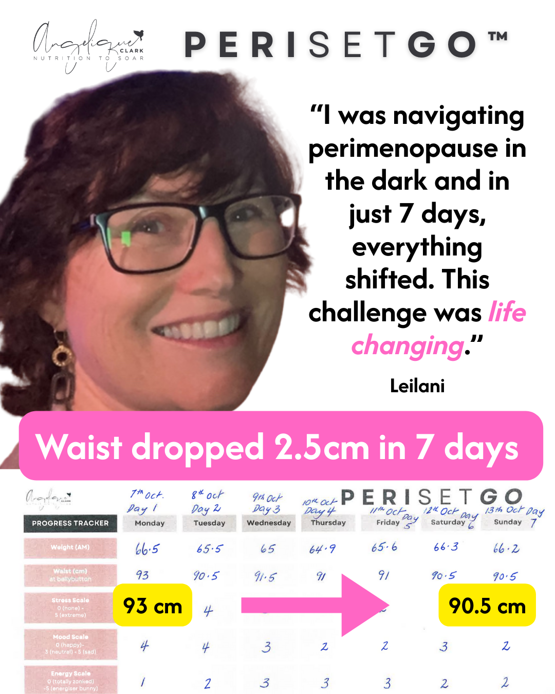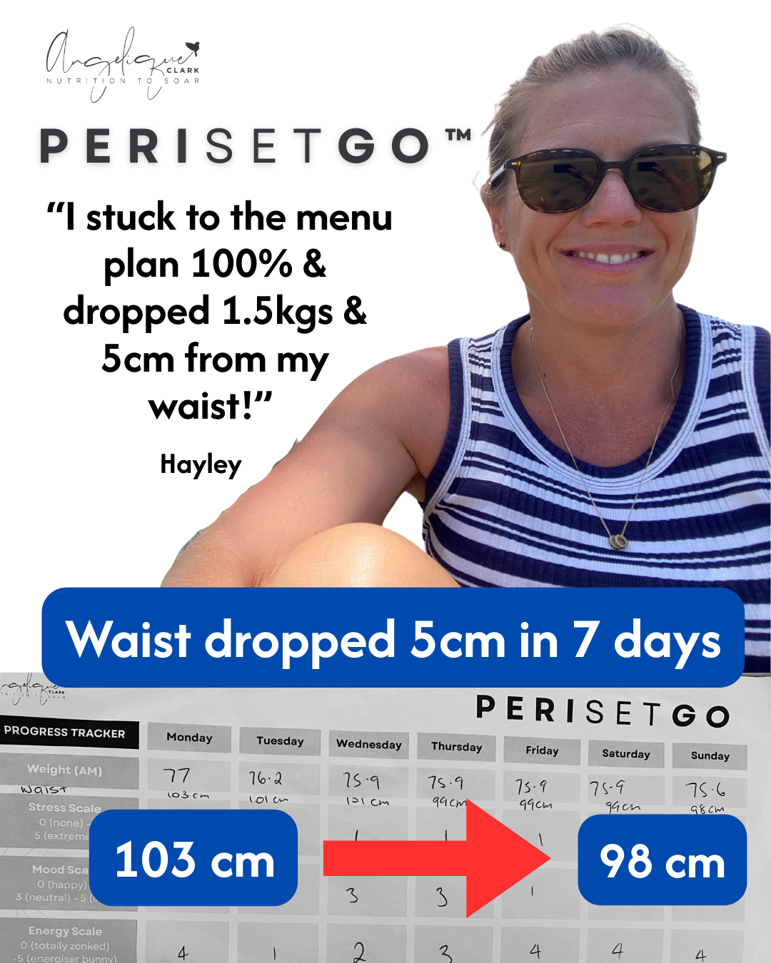 "I joined Peri Set Go to educate myself on how to lose peri belly fat and get some new recipe ideas. I certainly achieved this (1kg and 2cm from my waist), but to my surprise I got so much more than I bargained for. The daily bites of information gave me a solid understanding of what is happening during peri and provided tangible tools to improve things.